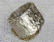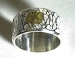 ![]() | 写真では真中に金を薄く伸ばして張ってみました、なかなかきれいですよ、もちろん金を張ってからぶったたきはじめるんですよ、もう一つ、シルバーには白仕上げと言って、真っ白に仕上げる事が出来ます、そうすると光る線の部分と白のコントラストがなんとも言えず上品な感じのシルバーリングに仕上がります、 |