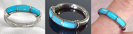 ネイティブ感に加えて、少し控えめでそれでもトルコ石にはこだわりをみせる、、といった雰囲気を持ったリングです。あまり目立つトルコ石 よりさりげなくトルコ石ブルーを楽しみたいという方、初めてトルコ石を身につけてみたいという方にもお勧めです。 このシリーズには、,真中に珊瑚の入ったもの、オニキスの入ったものもあります。